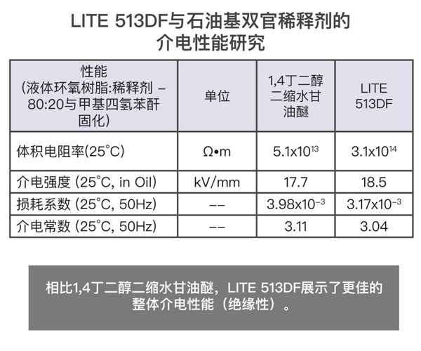 根據(jù)IEC 62631和IEC 60243標(biāo)準(zhǔn)進行測試,如其介電性能所示,LITE 513DF提供了良好的絕緣性能。在Epon 828的配方中,樹脂的使用量為20%,用MTHPA(甲基四氫鄰二甲酸酐)固化,并用BDMA(芐基二甲胺)催化。LITE 513DF展示了優(yōu)異的結(jié)果,其體積電阻率和介電強度更高,損耗因數(shù)和介電常數(shù)比競品1,4丁二醇二縮水甘油醚更低。當(dāng)兩種稀釋環(huán)氧樹脂體系都暴露于高溫或鹽溶液中時,LITE 513DF的性能優(yōu)于石油基雙官能稀釋劑。LITE 513DF是一款良好的環(huán)氧稀釋劑和改性劑,適用于電氣灌封、鑄造和封裝(浸漬樹脂)。